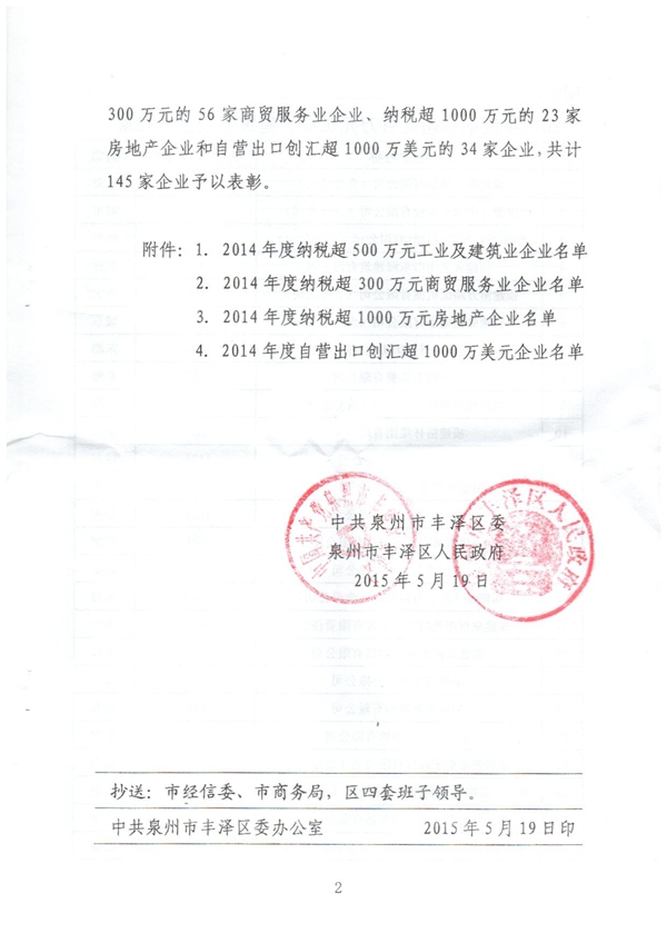 豐澤區(qū)委區(qū)政府以2015第22號文件形式?jīng)Q定對納稅超500萬的32家的工業(yè)企業(yè)、納稅超300萬的56家工貿(mào)企業(yè)、納稅超1000萬的23家地產(chǎn)企業(yè)、納稅超1000萬美元的34家出口企業(yè)進(jìn)行集中表彰。