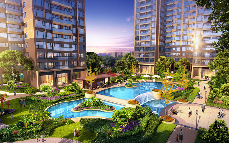 園林設計以現代景觀意境為設計理念,結合項目的空間結構,運用巧妙的設計手法,演繹出一條帶有層次的情緒歸家動線(到達→過渡→中心花園→過渡→組團花園),園林面積共1.8萬㎡,采用總體思維空間造景手法,打造多功能復合型景觀,栽種了金浦桃、黃金榕、黃龍船花、鶴望蘭等名貴樹/花種;項目打造了18米寬闊氣大門,給予業主五星酒店尊貴前廷歸家感受;社區內有籃球場、兒童游樂場,太極廣場、全齡游泳池、游步道、聚集庭院,打造溫馨自然閑適后苑居家氛圍。